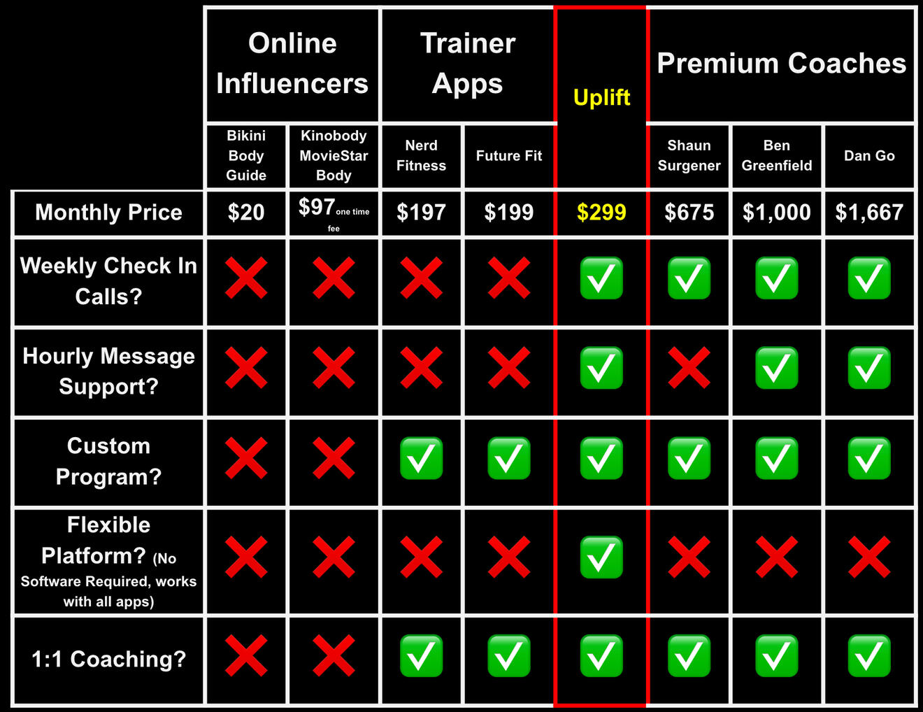 Most budget apps and influencer programs leave you on your own — minimal coaching, no real accountability. Premium coaches offer real support, but they charge $1,000 to $1,600+ per month. Uplift gives you the depth, personalization, and daily access you deserve — at a fraction of the cost. You get elite-level coaching without elite-level pricing.
